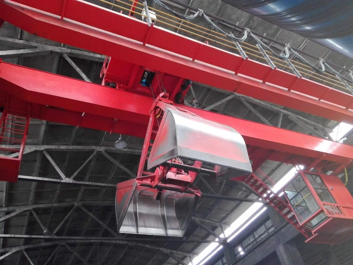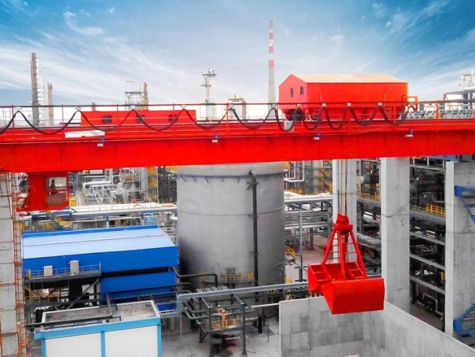 The double-girder grab overhead crane consists mainly of dual main girders, grab buckets, electric trolleys, driver cabins, and electrical control systems. It is equipped with a dual-drum hoisting mechanism arranged symmetrically, offering strong grabbing capacity, stable operation, high efficiency, and heavy load capabilities. The crane is integrated with a fully automated warehouse management system, enabling warehouse location management, task scheduling, equipment monitoring, and data statistics. It interfaces with the user’s production management system to achieve highly intelligent control. Its 3D scanning system for storage areas provides real-time monitoring of material distribution.
